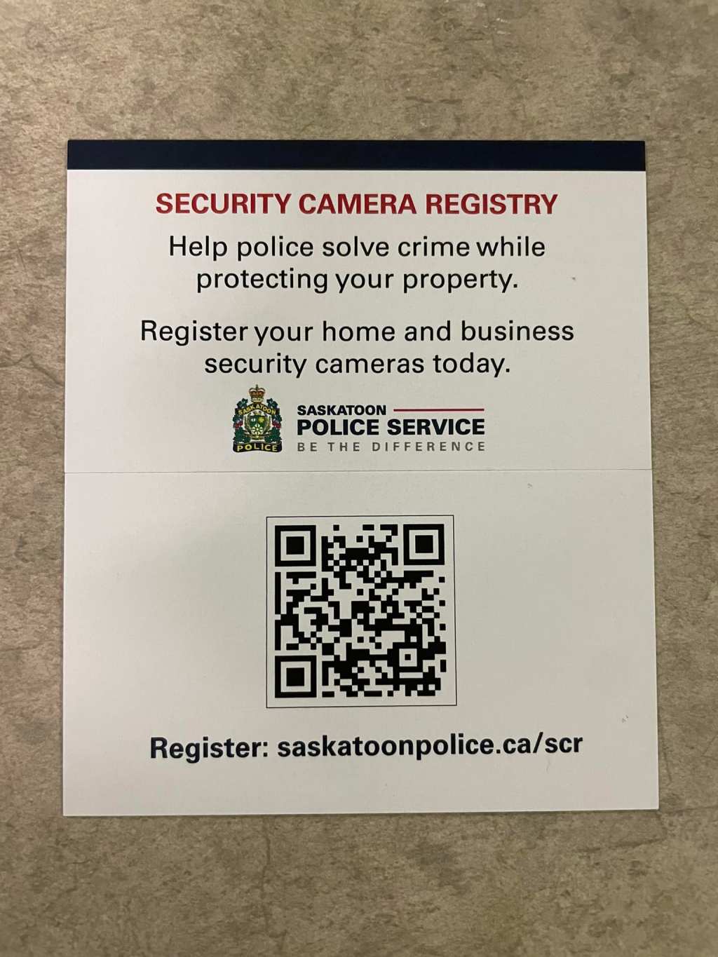 The Security Camera Registry is a new initiative this year by the Saskatoon Police Service! It is a completely voluntary program where community members (individuals or businesses) can register their security camera(s) with the Saskatoon Police Service. Register here: https://saskatoonpolice.ca/scr/.
