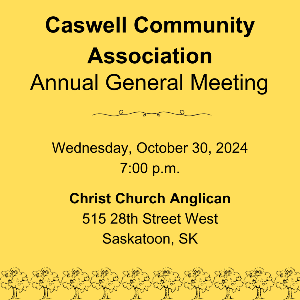 Notice of Annual General Meeting: The Caswell Community Association will hold its Annual General Meeting on Wednesday, October 30, at 7:00 p.m. at Christ Church Anglican, 515 28th Street West.